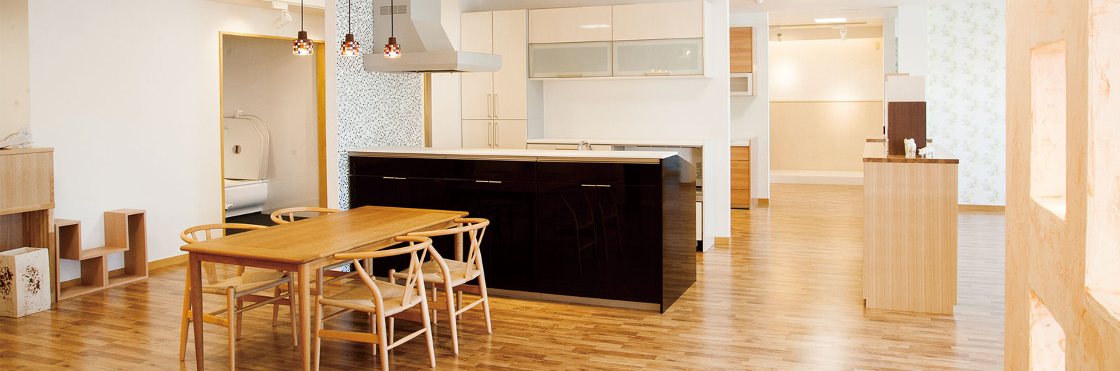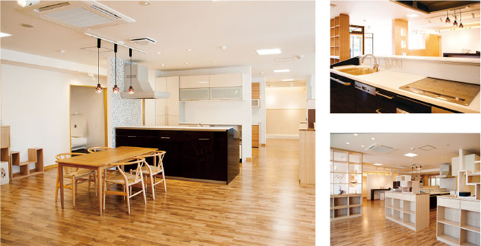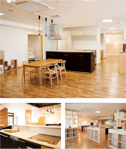 カメカメホーム郡山展示場では、広々とした空間の中、展示物をゆっくりご見学いただけます。数々のノウハウ、こだわりのアイデアで、お料理が楽しくなるような快適キッチン、家族が自然と集まる明るいリビングなどライフスタイルに合わせたご提案をさせていただきます。
